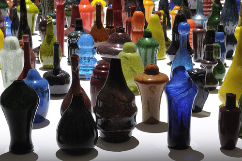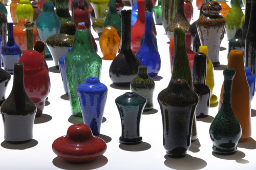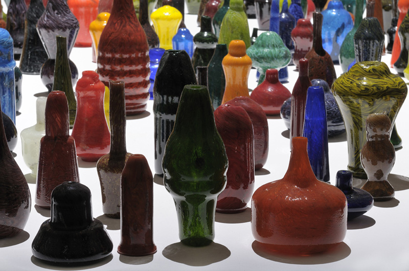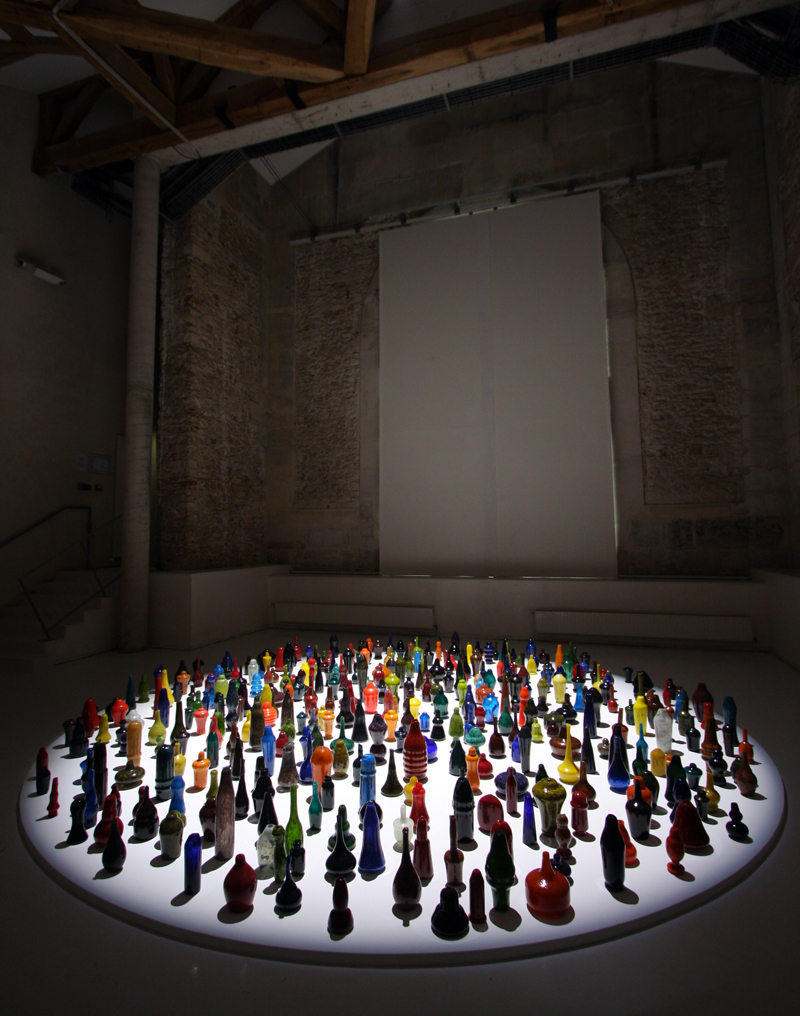 404 empreintes en verre soufflé, socle en bois, 650cm