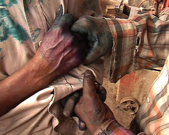 The men’s movements and faces are bodily filmed; the skin’s omnipresence contributes to the sensuality, even sexuality transpiring from the images. François Daireaux multiplies shots of the workers hands maneuvering the blowpipes, the soft and loose forms of the glass, shots of necks, nude torsos, the resting (the film is punctuated with images of lying bodies or slack hands) or even the subtle hip swigs of the workers molding the matter. Thus the artist alternates inside shots of the factories and static shots of the walls around them: where there Hindi ads in white paint promote medicine for sexual aid. Referring to the Marxist theories which consider work and procreation as two modes of the same process of vital fertility, it is more the “preservation of the reproductive function” than the sexuality that is at stake. It is striking to see that, although absent from the Firozabi factories (with a few exceptions), the women’s body haunts the male universe pictured here, with this highly feminine accessory, the bangles.