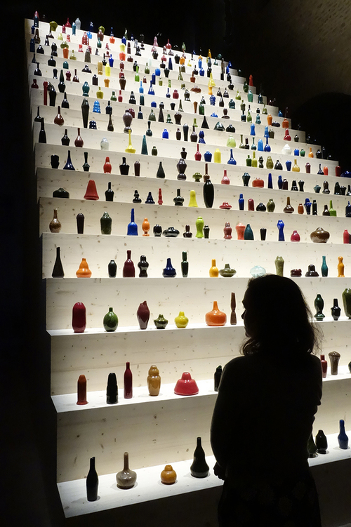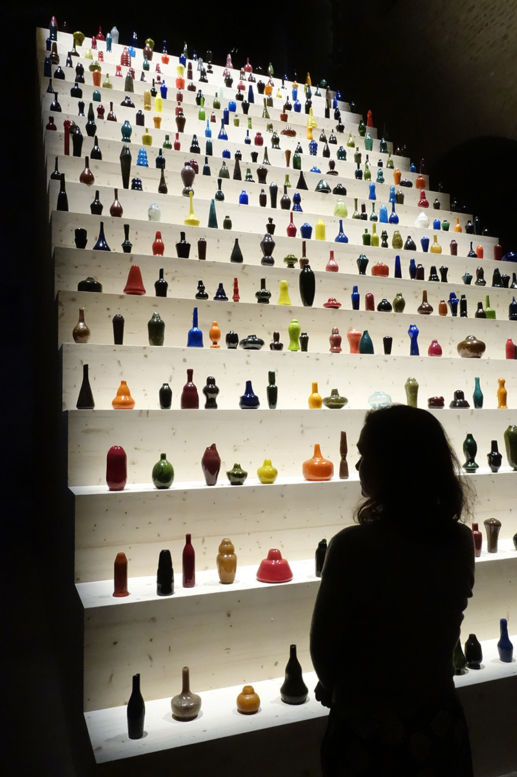 Pendant plusieurs années, l’artiste a fait l’expérience du territoire verrier de Firozabad, l’a photographié, l’a filmé et a réalisé l’inventaire de toute une production qu’il a ensuite délocalisée en l’exportant à Meisenthal au Centre international d’art verrier (CIAV). Une collection de 404 toras – bouquets de bangles entremêlés – a alors été soufflée dans des moules sauvegardés par le CIAV après les fermetures successives de nombreuses verreries lorraines. De là est née l’installation Blow Bangles composée de 404 “empreintes” de verre soufflées à la bouche par les artisans verriers de Meisenthal. À Saint-Pierre-aux-Nonnains, l’ensemble des “empreintes” sont disposées sur un socle à l’intérieur duquel est projeté le film Firozabad.