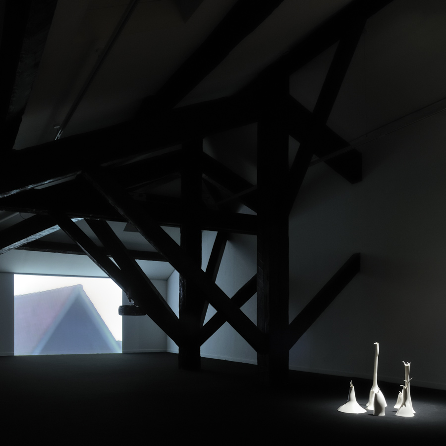 Au mur : Bruxelles, 2004. Vidéo couleurs, sonore, 3’50’’ en boucle, 1 vidéoprojection, format 4/3. Au sol : Sans titre, 1995. Plâtre laqué, dimensions variables.