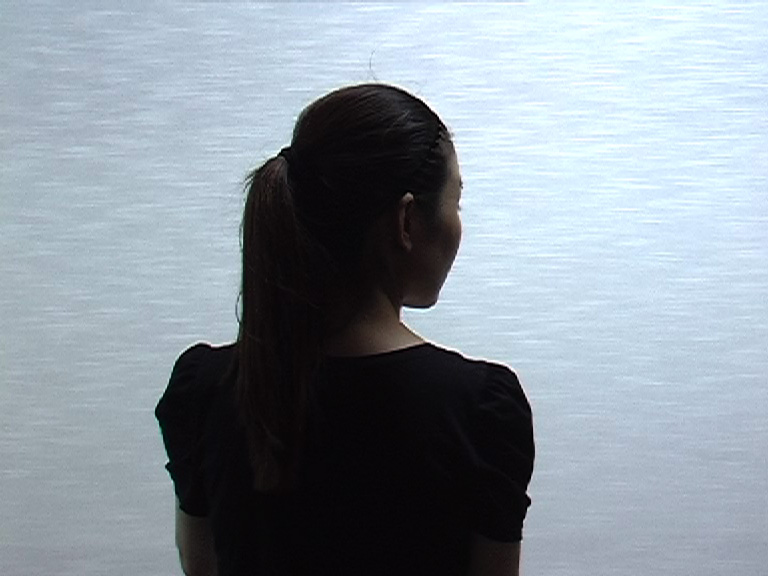 Ce que je vois est un film réalisé en Chine à Haining, ville ouvrière qui compte plus de huit mille fabriques textiles. Cette vidéo montre une ouvrière de dos dont le travail est de scruter des kilomètres de tissu afin d’y détecter le moindre défaut de fabrication. Le corps de la jeune femme oscille dans un interminable va et vient droite-gauche face au tissu qui n’en finit pas de tomber et devient par là même rideau. Une lumière du jour, qui happe et tiens à la fois à distance, irradie le visage que nous ne verrons jamais ou avec si peu de détails que la reconnaissance n’est pas possible.