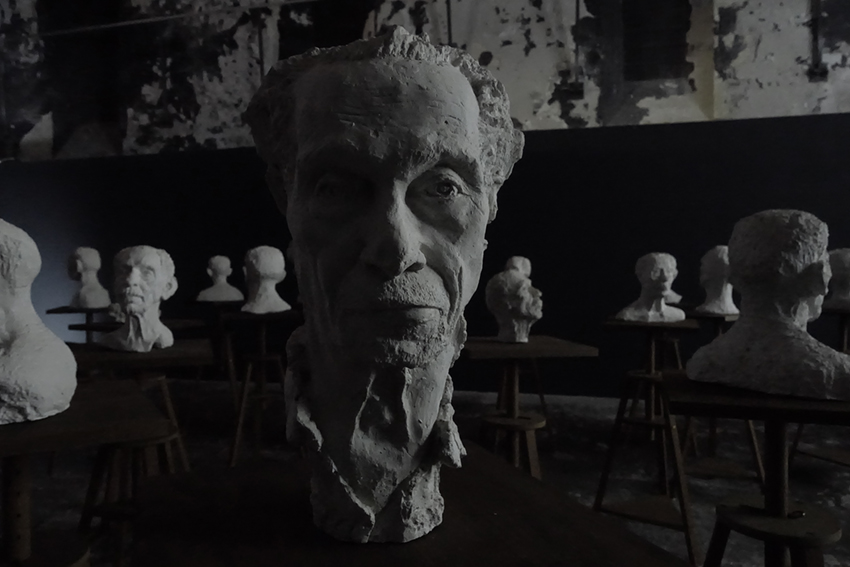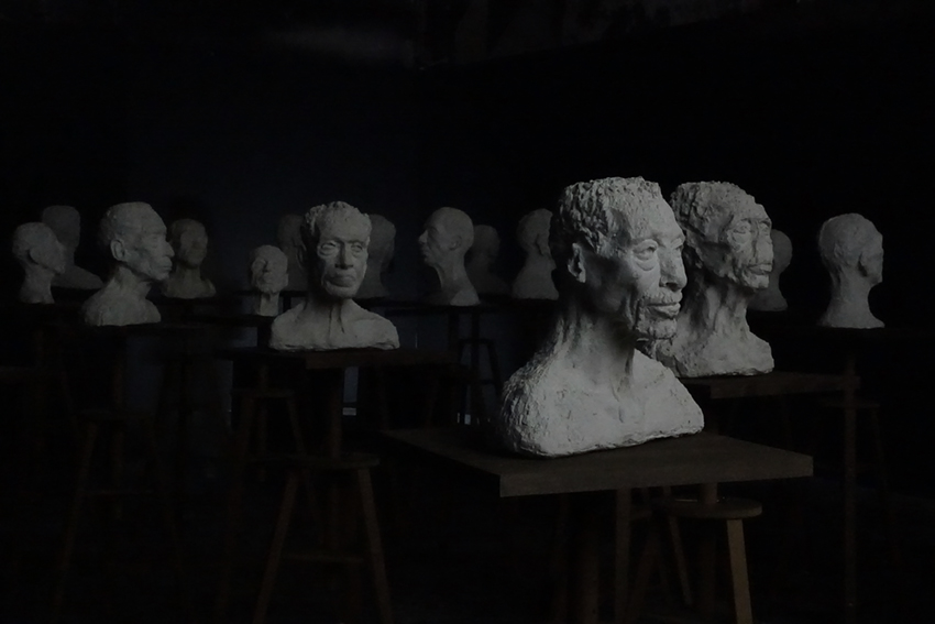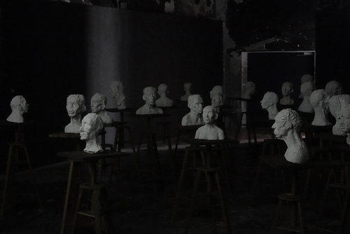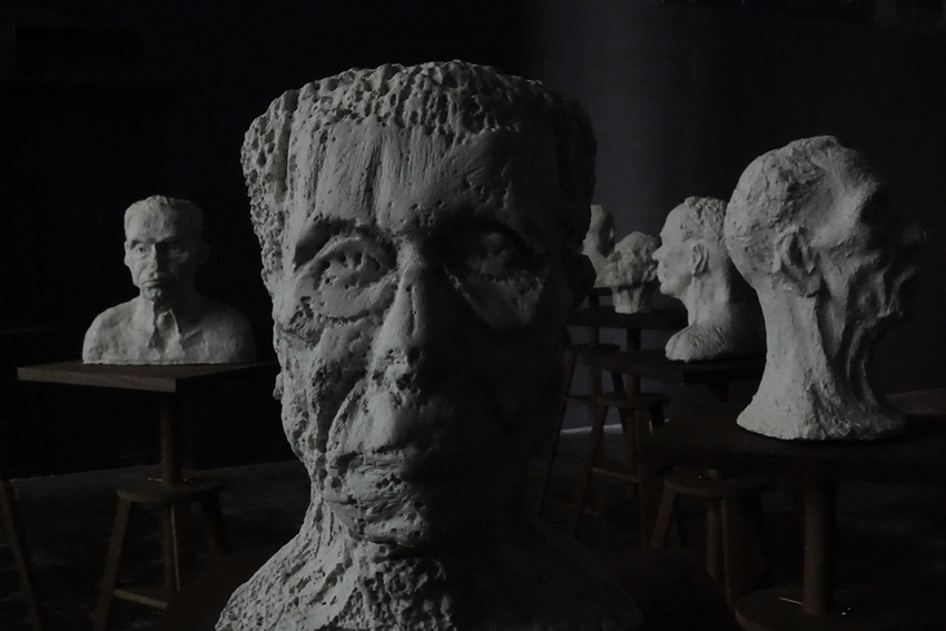 28 bustes en plâtre sur 28 selles de sculpteur