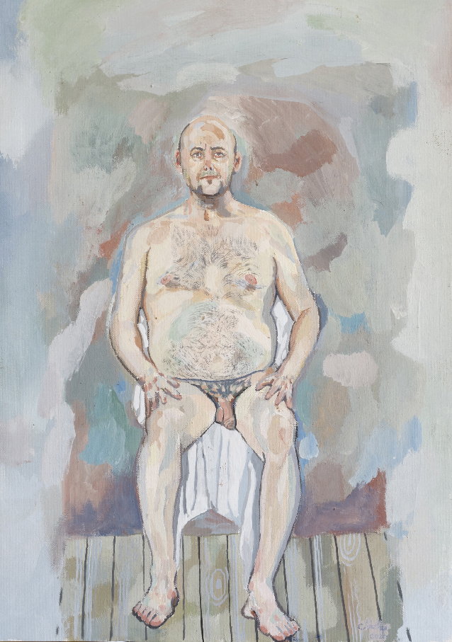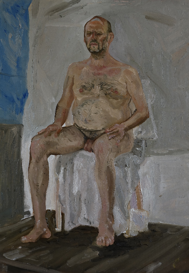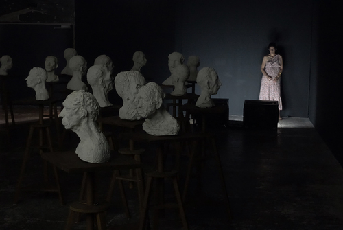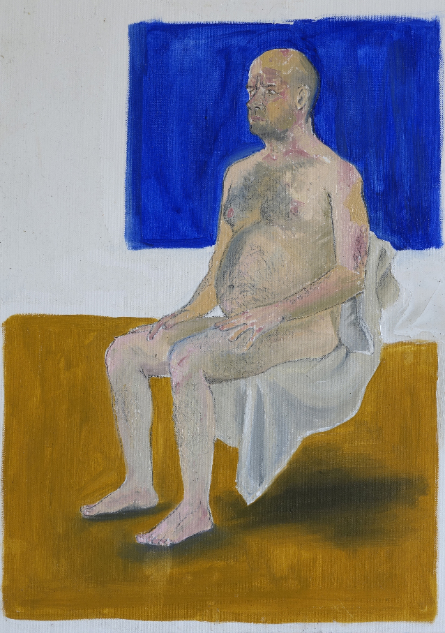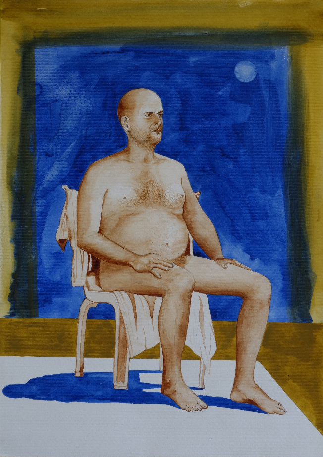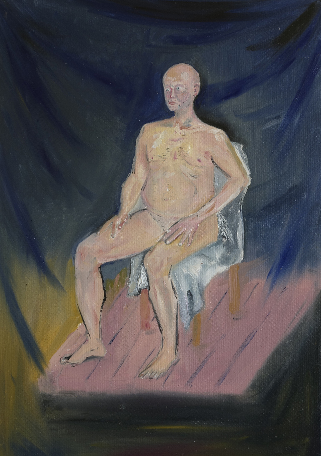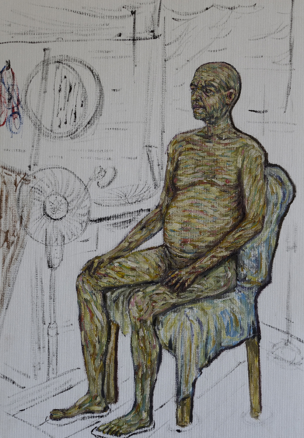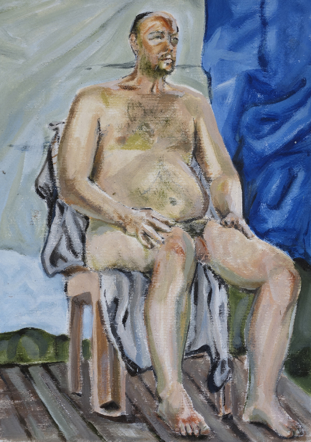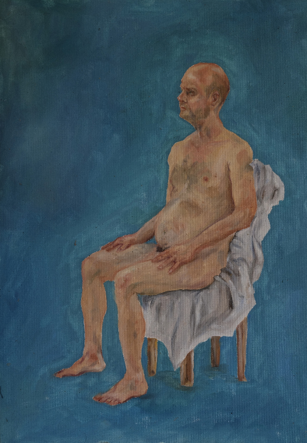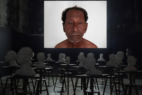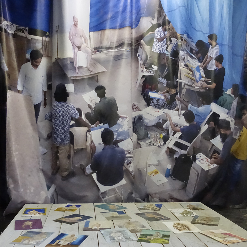 En avril 2010 j’appris qu’il s’était suicidé après une ultime pose. Profondément affecté par cette nouvelle, je me souvenais qu’en faisant ce projet d’installation avec lui, j’avais l’étrange prémonition qu’il disparaîtrait après coup. En février 2020, je me rendis à nouveau dans l’école. Les bustes en plâtre avaient disparu avec le temps. Je me sentais dépositaire d’une partie de l’histoire de Chellappan que j’avais préservée par les moulages et le film. Je rencontrai deux des derniers modèles vivants de l’école qui l’avaient bien connu. Un homme, Krishnapillai et une femme, Laila. Je décidai de réaliser un portrait filmé de chacun en recueillant leurs témoignages sur la vie et les derniers jours de Chellappan. Les convergences et les divergences de ces deux récits participaient à alimenter les mystères autour de cet homme qui encore aujourd’hui continue de hanter l’école. Ayant appris des étudiants qu’il leur était impossible de peindre un modèle nu, ceci étant socialement proscrit, je leur proposai de poser nu une journée, de rendre ainsi un ultime hommage à Chellappan. Cela eut lieu dans un entrepôt en périphérie de Trivandrum. Le 6 février 2020, 19 peintures furent ainsi produites par les étudiants qui me confièrent leur difficulté à trouver la carnation du « modèle blanc ».