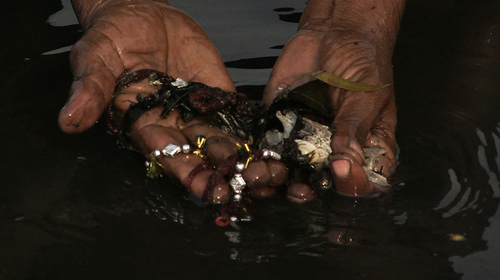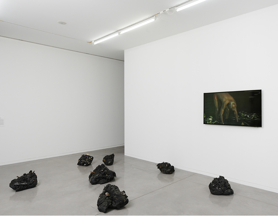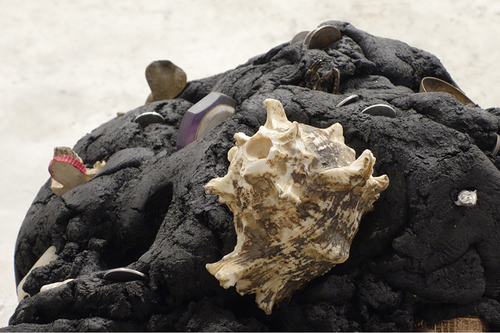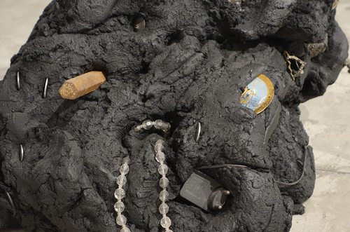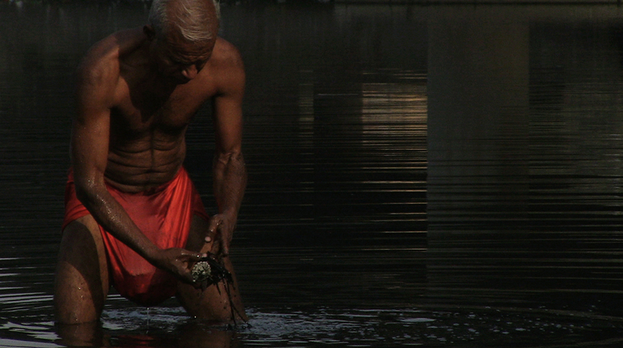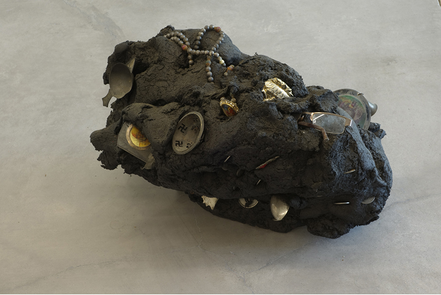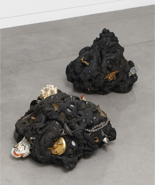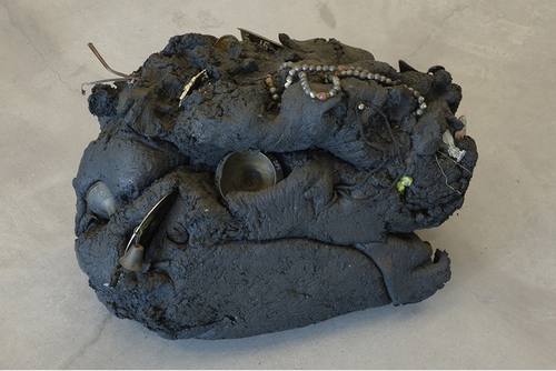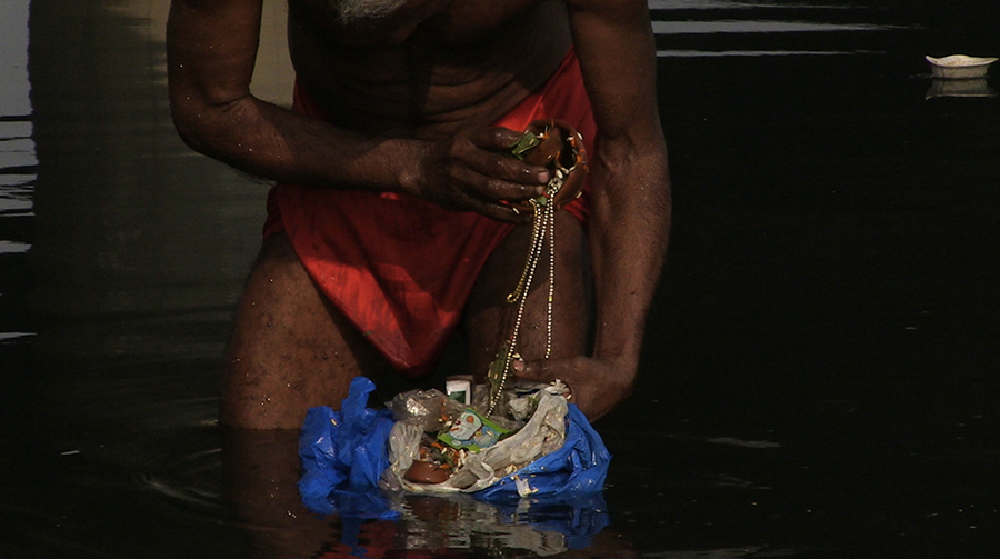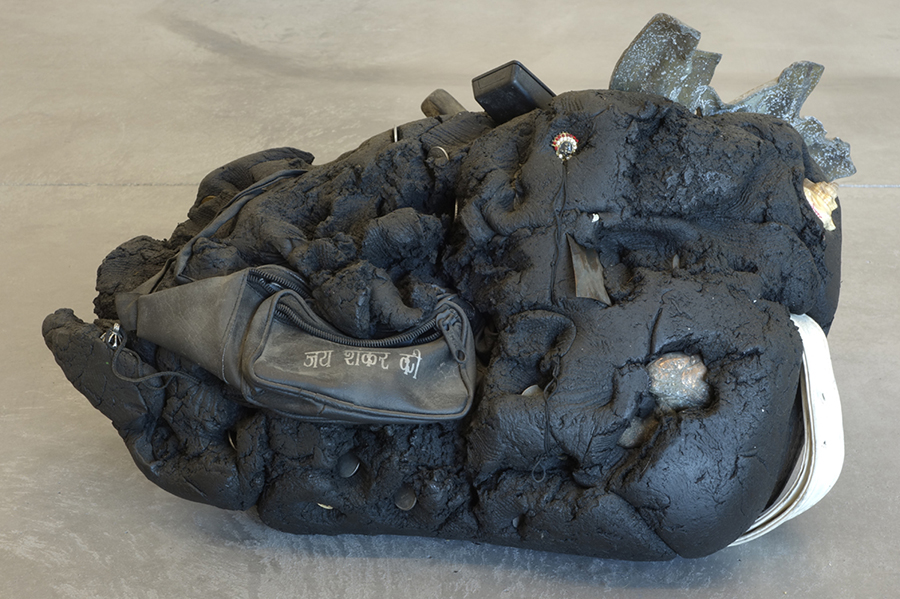 "Au hasard de mes pérégrinations sur les bords de la rivière Yamuna à New Delhi, j’ai rencontré Augustin Ghadge. Chaque jour, depuis des dizaines d’années, Augustin s’est engagé à fouiller la rivière pour la nettoyer mais aussi pour y trouver des objets qu’il revend. Augustin aime à dire :« Je suis un travailleur social ». Avec le peu d’argent récupéré de la vente de ces objets, il subvient à ses propres besoins mais surtout porte assistance aux personnes qui comme lui vivent sur les bords de la Yamuna. Depuis 2014, je travaille sur un film long avec Augustin et d’autres personnages qui vivent au bord de la Yamuna dont les eaux sont à la fois sacrées et mortelles à cause de l’extrême pollution. Avec l’installation "Augustin Seven Days", j’ai souhaité rendre hommage à cet homme, enfant pauvre du Maharashtra, converti au catholicisme à l’âge de 8 ans, monté à Delhi à l’âge de 33 ans pour vivre comme le Christ au bord de la Yamuna et y collecter les objets provenant de rituels hindous jetés dans la rivière. Les 7 sculptures ont été réalisées à partir des objets collectés par Augustin au fond de la rivière Yamuna durant 7 jours. Nous avions convenu que je serais l’acheteur de ces objets pour ensuite les plonger dans une masse de caoutchouc noir qui évoque le fond noir de la rivière Yamuna. Augustin était tout à fait au courant du processus de travail que nous étions en train d’effectuer ensemble. Pour lui participer à cette œuvre était l’occasion d’être entendu ou perçu en dehors de ces eaux noires de pollution. "