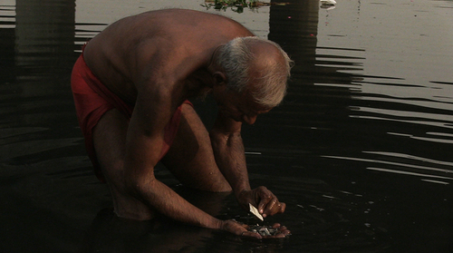 en caoutchouc avec des objets provenant de la rivière Yamuna, New Delhi, Inde.