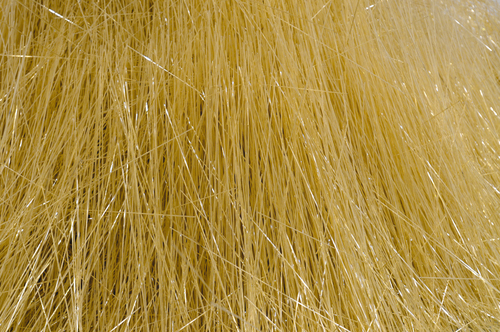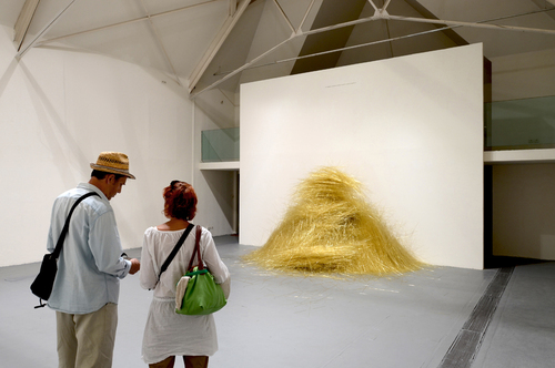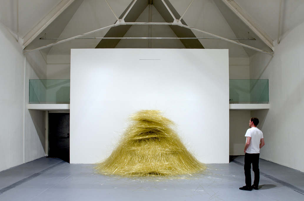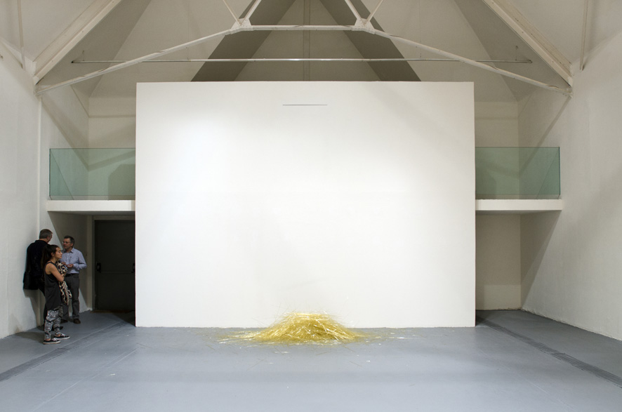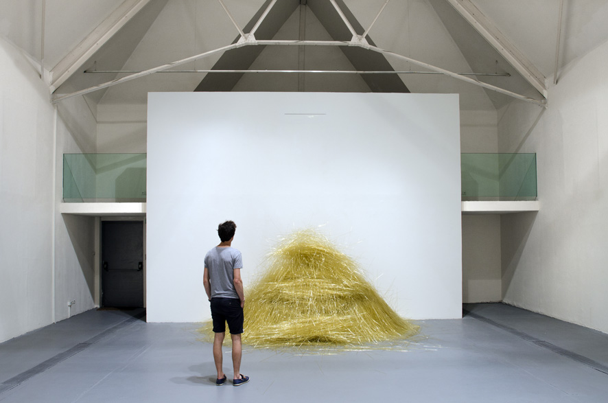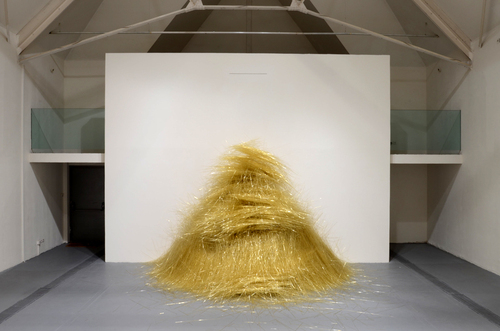 Those who have seen François Daireaux’s film Firozabad [1] will easily recognize its principal motif, these slim tubes of glass that are used to create the small ornamental beads in the eponymous city/factory. The artist bought a ton of golden ones, about 200 000 tubes, and had them transported from India to this exhibition space in Europe. The tubes fall, at a rate of one every two seconds, during the entire period when the exhibition is open to the public. What could be more familiar now than this eternally renewed dialectic from local to global, than the trajectory of a material, transformed and produced in Asia for example, purchased wholesale and then transported by sea or air to wherever markets (near or far) require them?