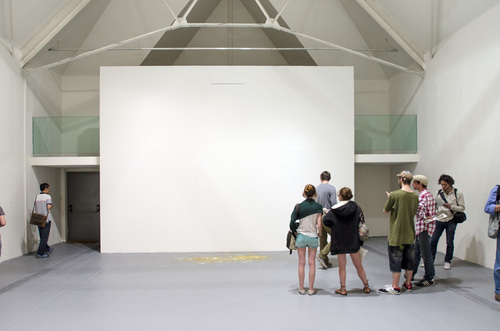 From the outset, the white wall draws its ambient veil of welcome through the special historical sedimentation that has made it seem normal as an ideal in our collective imagination: asocial, smooth. There is a surprise, however, with the repetitive falling stream of glass tubes and the ineluctable pile they create on the floor—we can clearly imagine the visual impact and emotional charge of what will ultimately become a small mountain of entangled tubes. There is nothing more to see than this wall exhibiting a strict frontality barred by a slit, from which the stream falls in an apparently regular cadence. A seemingly ceremonious piece of machinery and nothing else? Or nearly so.
