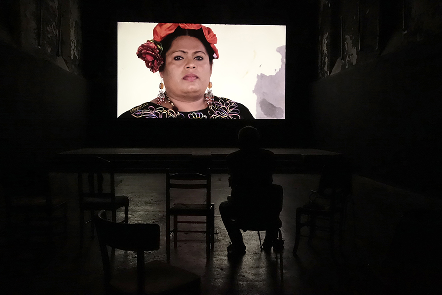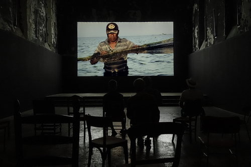 Petit village aux rues orthonormées flanquées de maisons basses, Alvaro Obregon est plutôt calme, loin des violences urbaines des banlieues de la capitale. François Daireaux alterne ce calme dans l’ombre des yeux d’Isidro ou au clair de l’eau avec la foule colorée des marchés bondés où braillent des haut-parleurs ou des aboyeurs d’apocalypse. Une vache est abattue. Le regard de l’artiste zoome sur le flanc blessé par où s’écoule le sang dans la poussière. L’agonie de la bête est un élément du décor pour tous ici. Entre deux voyages de l’artiste au Mexique sur ces eaux sacrées, la terre a tremblé, fort, plus de 8 sur l’échelle. Isidro raconte le soulèvement des eaux, des terres, les effondrements, le son épouvantable et la peur populaire qui se tourne par dépit vers les religieux de l’apocalypse. Le désastre. François Daireaux ne coupe rien, tout ce qui est dit est dit. Sa respiration, ses silences, ses regards, le son de l’eau et les gestes gracieux dans l’océan. Le calme est revenu sur les lagunes grises et bleues et les tentatives de pêches émaillent les jours tranquilles à Alvaro Obregon.