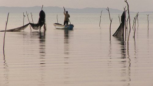 Le paysage est filmé à ras d’horizon, sur ces lagunes immenses où des pêcheurs solitaires travaillent leurs filets. Le poisson est rare. Au loin les fantomatiques éoliennes contre lesquelles le peuple s’est soulevé. Le son et l’éclat de l’eau calme sur laquelle des oiseaux hésitants semblent marcher furtifs, dressés comme les perches de bois sec qui font ces verticales fragiles et sombres sur l’océan gris-bleu. Parfois la lumière du soir est telle que l’eau devient un écran qui grésille accompagné d’un bruit blanc, au bord de l’abstraction. Un homme seul marche dans l’eau. L’alternance de ces solitudes avec la voix d’Isidro. Le son de la lagune, presque un silence naturel et à nouveau la voix paisible. Dans la pénombre de sa maison fissurée, il continue de raconter. Tu filmes ?