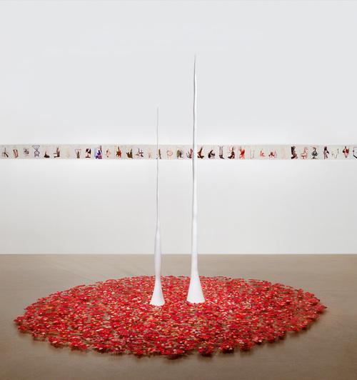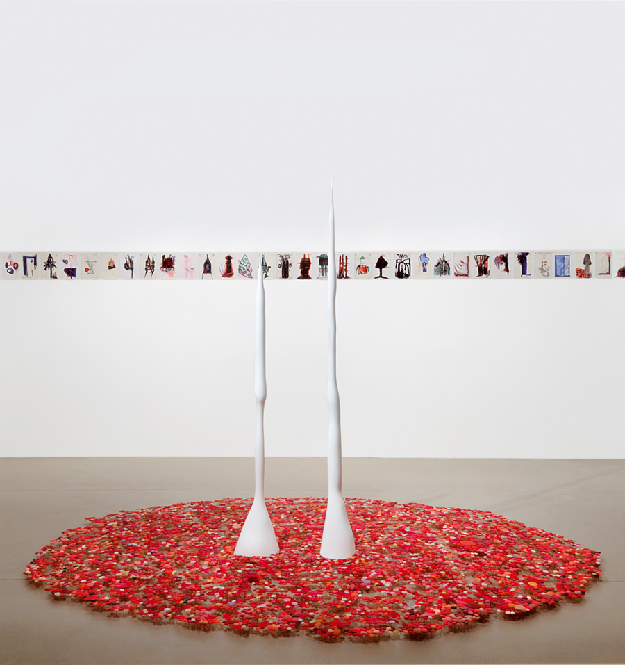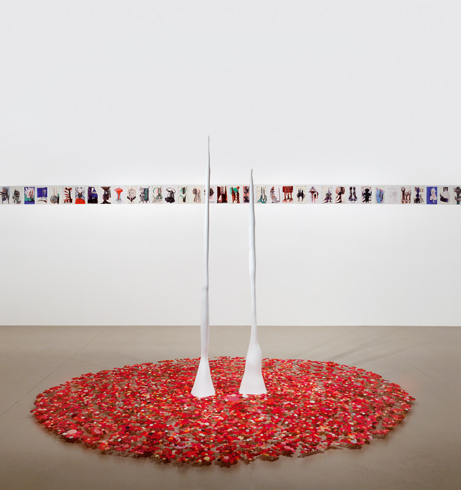 Au mur : Sans titre, 1997. 3éme ensemble de 40 dessins, encre sur papier, 20,8 x 13,5 cm. Au sol : Sans titre (1re partie), 1998. Plâtre, laque polyester, vernis à ongles sur colle thermofusible, épingles, dimensions variables.