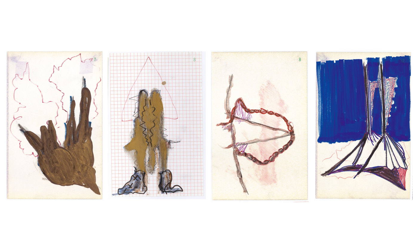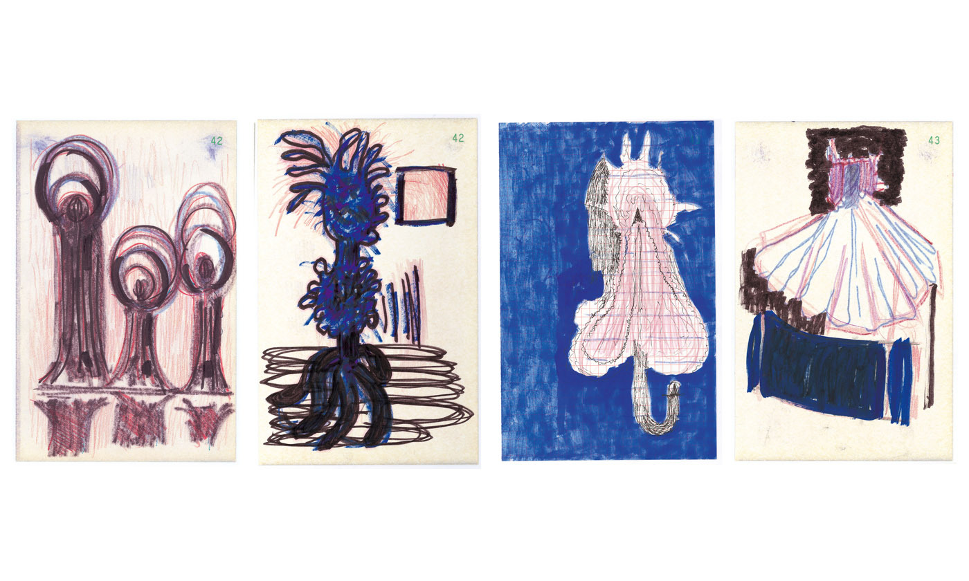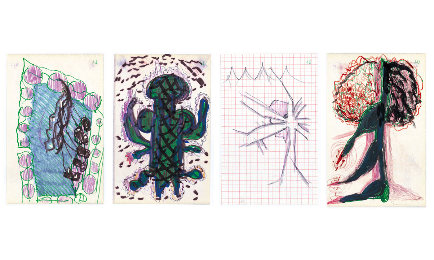Au mur : Sans titre, 1997. 1er ensemble de 40 dessins, encre sur papier, 20,8 x 13,5 cm.