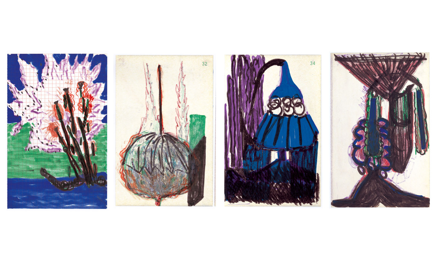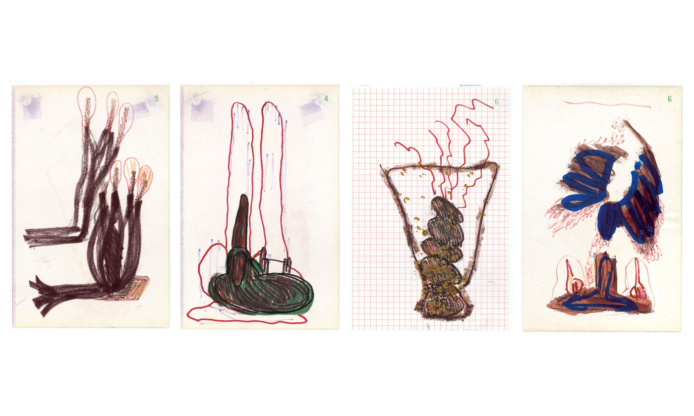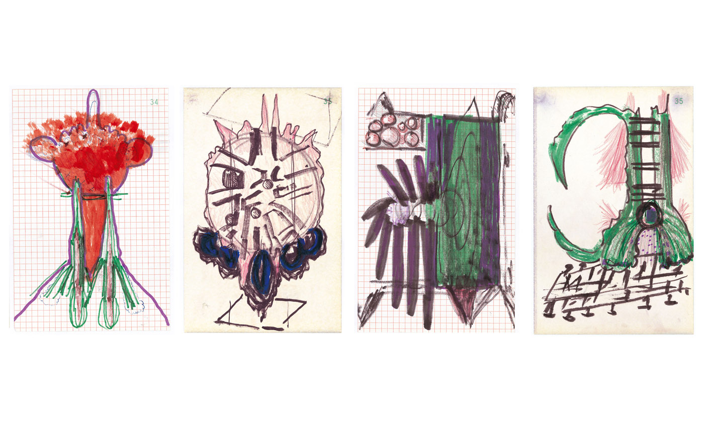 Au mur : Sans titre, 1997. 1er ensemble de 40 dessins, encre sur papier, 20,8 x 13,5 cm.