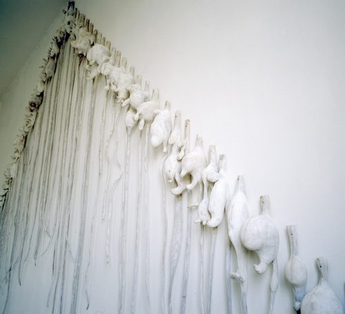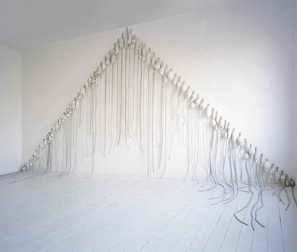 Series of 72 sculptures, nylon stockings, silicone, lithopone white pigment, variable dimensions.