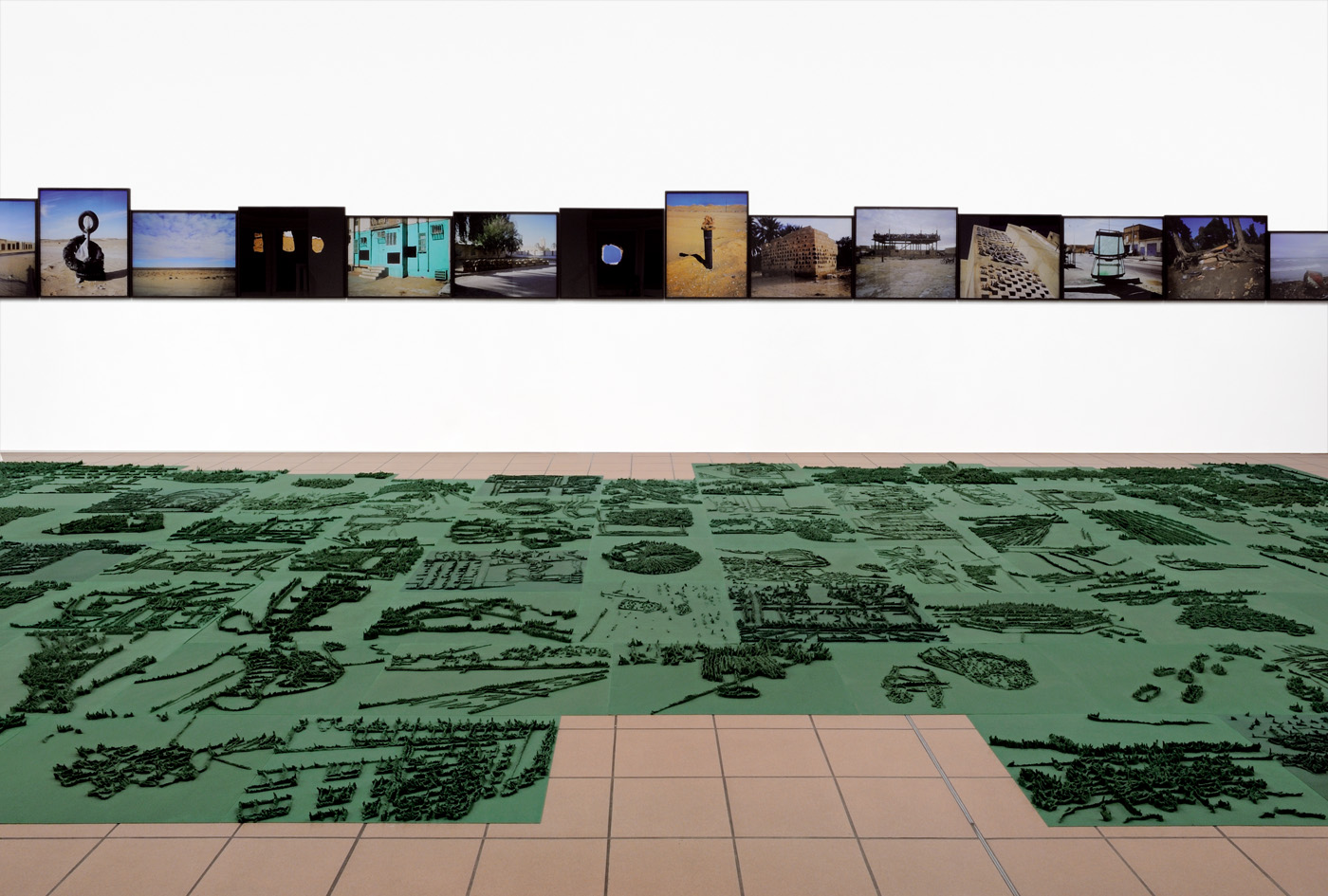 On wall: Series of color photographs, framed under glass.