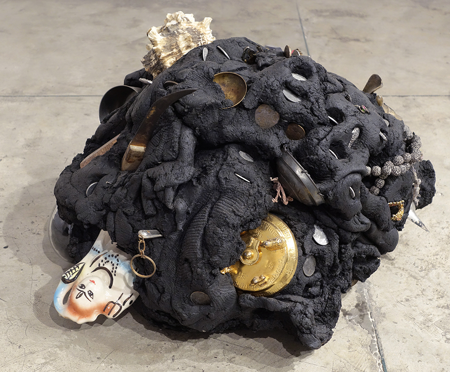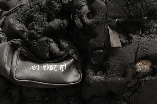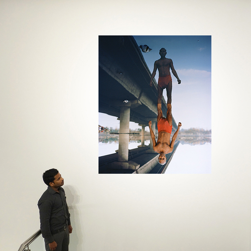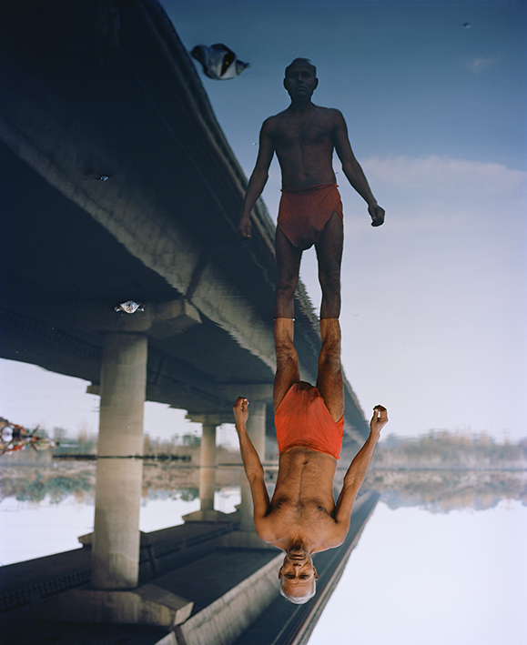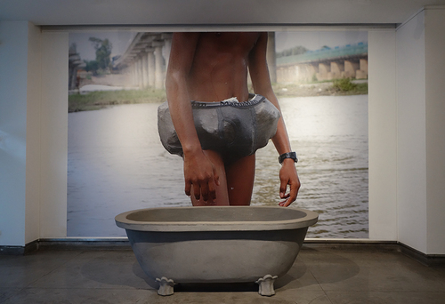 To swim in the murky waters of the Yamuna river, a teenager filled his bathing suit with bits of Styrofoam. Fragile body that tries not to sink in the middle of a natural environment threatened by gigantic concrete infrastructure. Styrofoam is the material usually used for packing goods. Here he protects a young body that indulges in the pleasure of swimming on the holy Yamuna river, expresses resistance to a global world that is dehumanized.